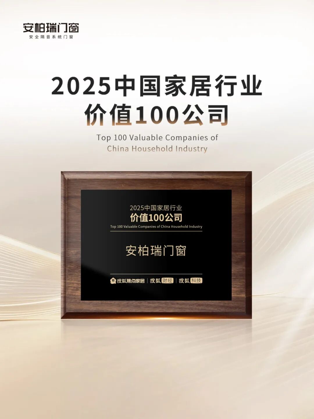 近日,由搜狐集团发起、权威行业协会指导、搜狐焦点家居主办的“2025中国家居行业价值100公司” 评选结果重磅发布。安柏瑞门窗凭借在整家定制领域的综合实力,经线上投票与专家评审双重认证,最终荣获“2025中国家居行业价值100公司”!